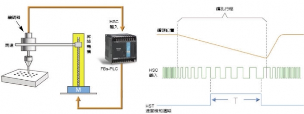 一部FBS-PLC有一組16位元之0.1mS之HST,而4個32位元之硬體高速計數(shù)器(HHSC)均設(shè) 有軟體開關(guān)。可個別轉(zhuǎn)換至SoC內(nèi)部之0.1mS時基而轉(zhuǎn)換為32位元之HST,因此最多可有4個32位元之HST。