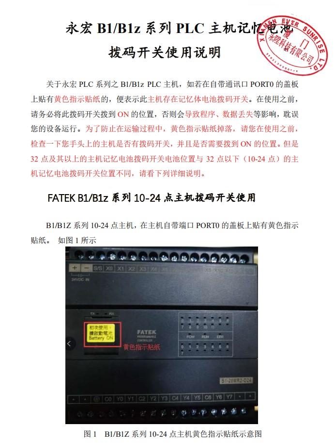 關(guān)于永宏P(guān)LC 系列之 B1/B1z PLC 主機(jī),如若在自帶通訊口 PORT0 的蓋板上貼有黃色指示貼紙的,便表示此主機(jī)存在記憶