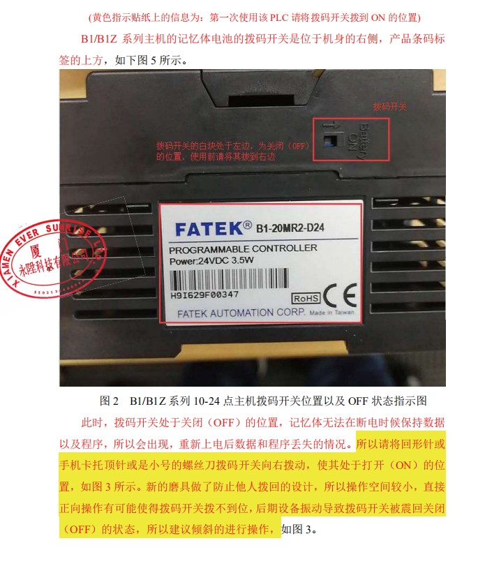 請務(wù)必將此撥碼開關(guān)撥到 ON 的位置,否則會導(dǎo)致程序、數(shù)據(jù)丟失等影響,耽誤您的設(shè)備運(yùn)行。為了防止在運(yùn)輸過程中,黃